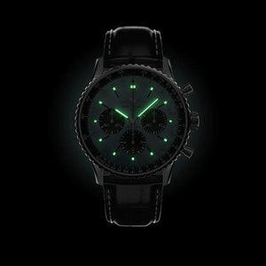 The black alligator leather strap with a stainless steel folding clasp ensures comfort and secure wear, whether in flight or during everyday use.