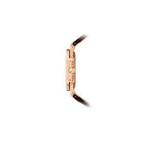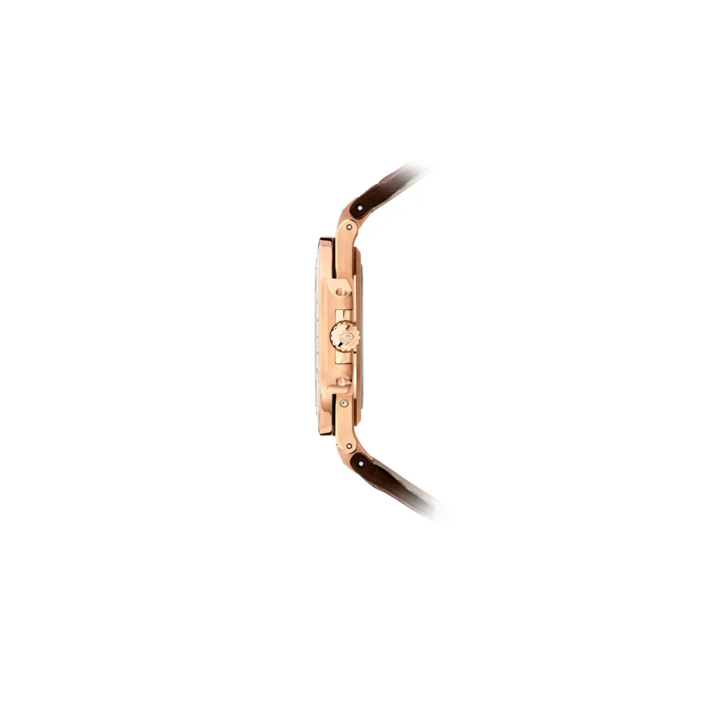 Luxurious 18K rose gold case with baguette diamond-set bezel.