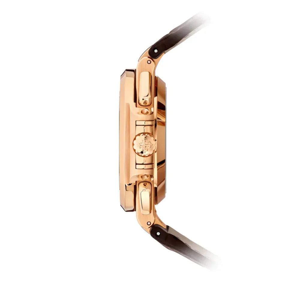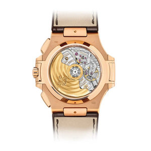 The PP Nautilus 5980R-001 is an iconic chronograph crafted in 18K rose gold, blending bold presence with refined elegance. Its 40.5 mm case and integrated bracelet reflect the timeless Nautilus design, while the brown sunburst dial with black gradient ensures a distinctive and luxurious aesthetic.