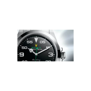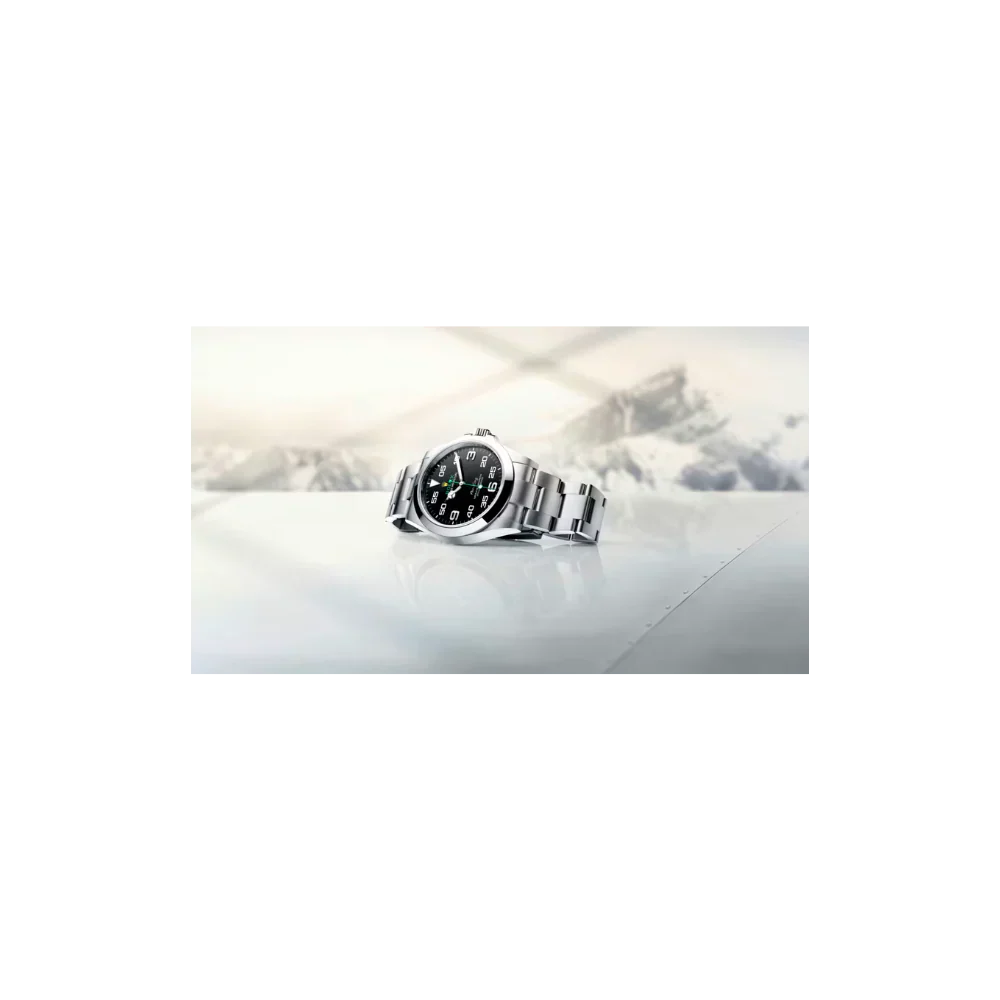 The RL Air-King 126900 is more than a timepiece — it is a celebration of RL’s aviation heritage, redesigned with modern precision and durability. Its bold black dial with oversized 3, 6, and 9 numerals ensures high legibility, while the green RL logo and yellow crown add a unique identity.
