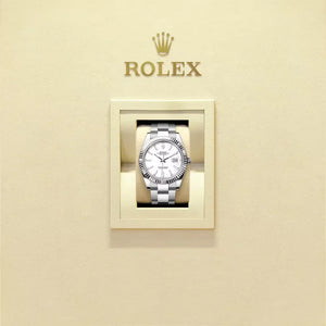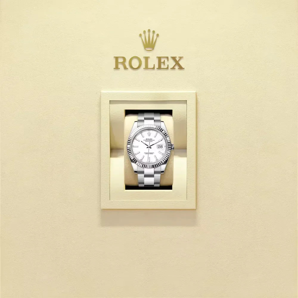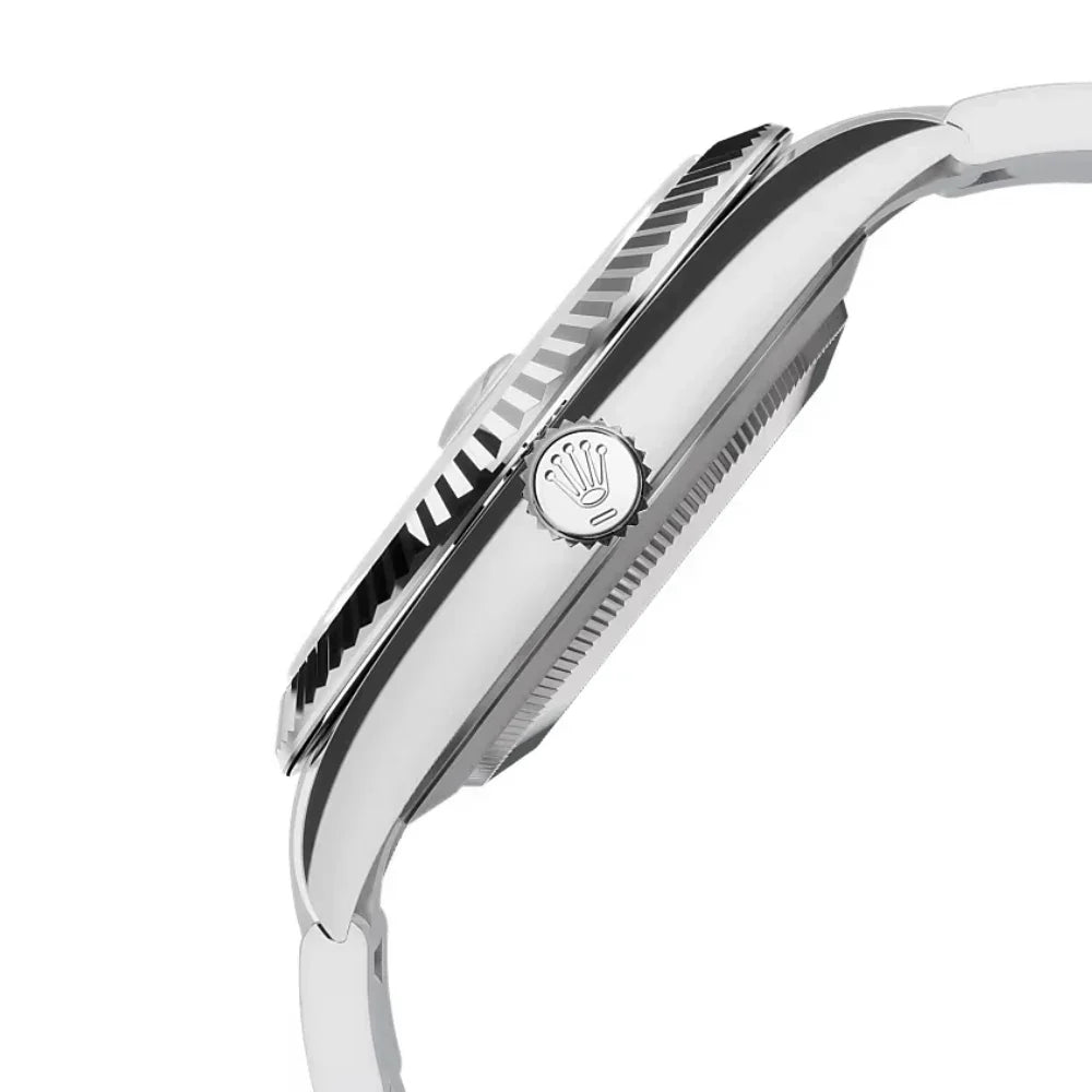 A hallmark of RL design, the fluted bezel, originally functional for waterproofing, now symbolizes timeless prestige. Rendered in 18 ct white gold, it elevates the Datejust 41âs classic appeal.