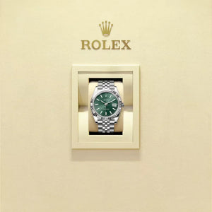 The RL Datejust Oystersteel Ref. 126334-0028 is a refined timepiece crafted in Oystersteel and white gold, featuring a captivating mint green dial, RL’s iconic fluted bezel, and the elegant Jubilee bracelet. A harmonious blend of durability, precision, and timeless design, it stands as an enduring symbol of sophistication in the Oyster Perpetual collection.