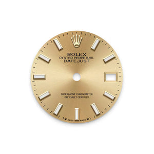 Dial: Champagne sunray with 18 ct yellow gold hands & indices, luminous fill