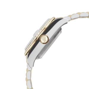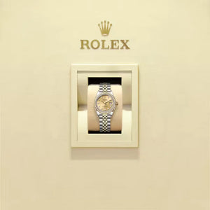 The RL Lady-Datejust 28 Ref. 279383RBR-0011 embodies timeless elegance and technical excellence. Crafted in Yellow Rolesor — a refined blend of Oystersteel and 18 ct yellow gold — this 28 mm model radiates sophistication. Its champagne sunray dial, set with diamond hour markers, captures light with delicate brilliance, while the diamond-set bezel adds luminous sparkle. Paired with the flowing Jubilee bracelet and hidden Crownclasp, this Lady-Datejust offers both refinement and comfort.
