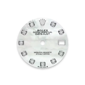 Dial: White mother-of-pearl with diamond hour markers in gold settings