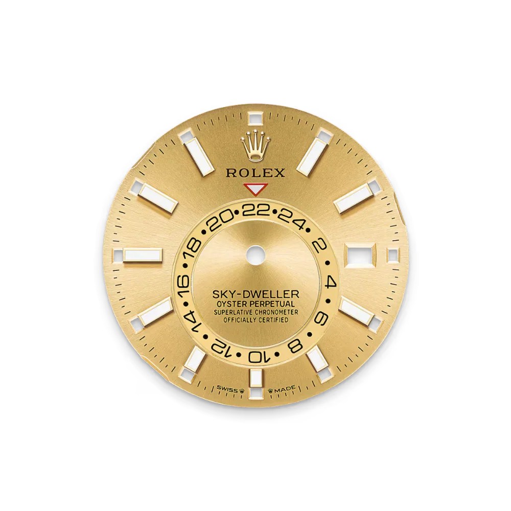 The RL Sky-Dweller Ref. M336938-0001 is the pinnacle of sophistication for global travelers. Its 42 mm Oyster case in 18 ct yellow gold, paired with a matching Oyster bracelet, exudes luxury. The fluted, bidirectional bezel features the Ring Command system, enabling seamless adjustments to local time, second time zone, and the annual calendar through bezel-and-crown interaction.
