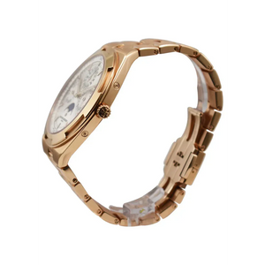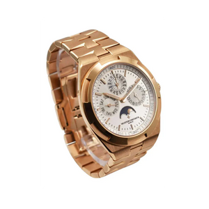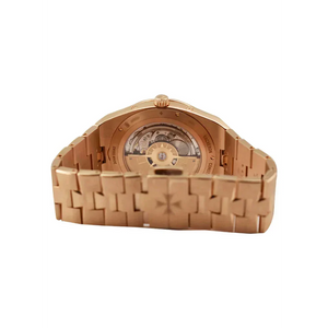 The V Constantin Overseas Perpetual Calendar Ultra‑Thin Ref. 4300V/120R‑B064 is the pinnacle of haute horlogerie elegance, seamlessly combining technical sophistication with sporty refinement. Housed in 18 kt rose gold, the watch measures 41.5 mm in diameter yet maintains an astonishingly slim profile of 8.10 mm, remarkable for a perpetual calendar complication.