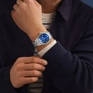 The V Self-Winding Ref. # 4500V/110A-B128 combines elegance, versatility, and technical mastery. Its sunburst blue dial with 18K gold accents, interchangeable strap system, and 150 m water resistance ensure both style and functionality. Powered by the robust in-house Caliber 5100 with 60-hour power reserve and Hallmark of Geneva certification, this watch offers precision, reliability, and effortless adaptability for any occasion